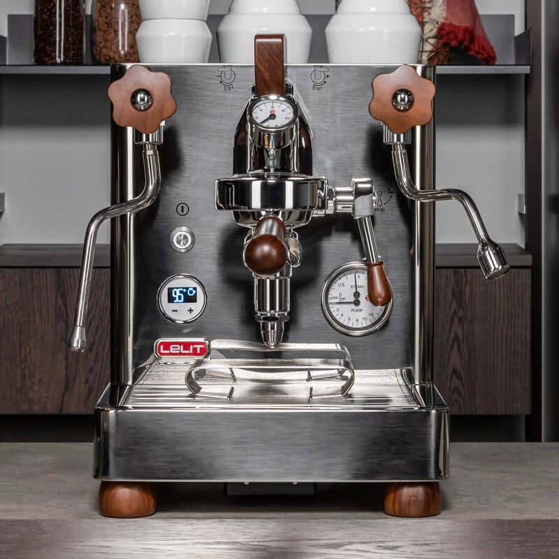 Die LELIT Bianca Siebträgermaschine ist nicht nur technisch auf höchstem Niveau, sondern überzeugt auch durch ihr ästhetisches Design. Die hochwertige Walnuss-Verkleidung verleiht der Siebträgermaschine eine zeitlose Eleganz und macht sie zum Blickfang in jeder Küche. Gleichmäßige Espresso-Extraktionen und eine optimale Temperaturstabilität sind dank der beiden, separaten Edelstahlkessel gewährleistet. Die bewährte Brühgruppe E61 macht die Extraktion zusätzlich optimal und der Druck lässt sich mit dem Paddel oberhalb der Brühgruppe individuell anpassen. Überwachen Sie hier den Druck über beide Manometer. Nach einer Aufheizzeit von bis zu 25 Minuten ist die Bianca Espressomaschine startklar für eine einwandfreie Kaffeezubereitung.