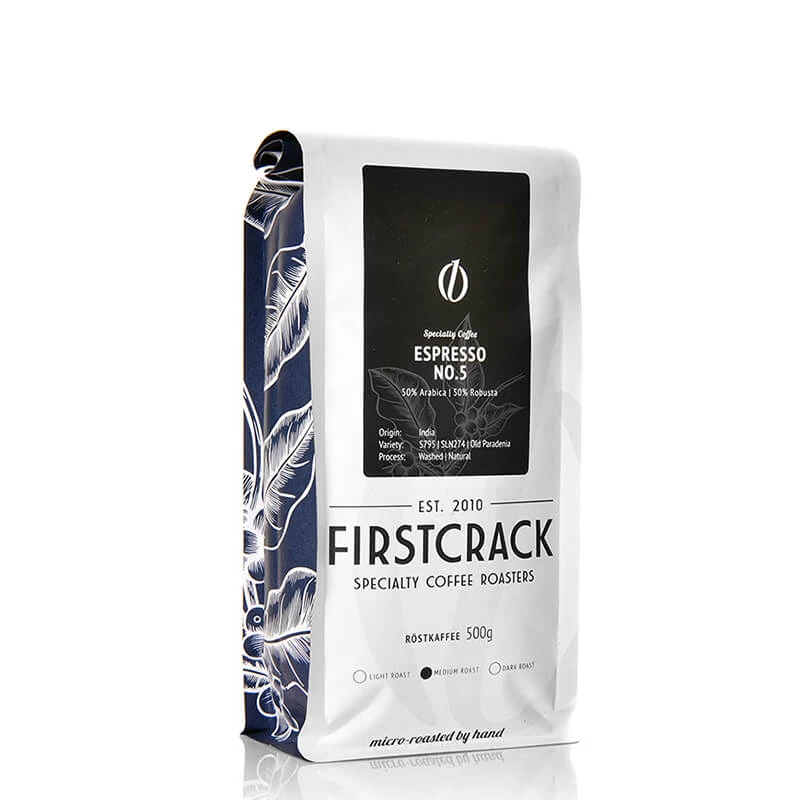 Der Espresso No. 5 von der FIRSTCRACK Roastery besteht zu 50 % aus Arabica Bohnen und zu 50 % aus Robusta Bohnen. Es handelt sich um die Varietäten S795, SLN274 und Old Paradenia. Die Bohnen wurden washed und anarobic natural aufbereitet. Anschließend wurden sie per Hand zu einem mittleren Röstgrad geröstet.