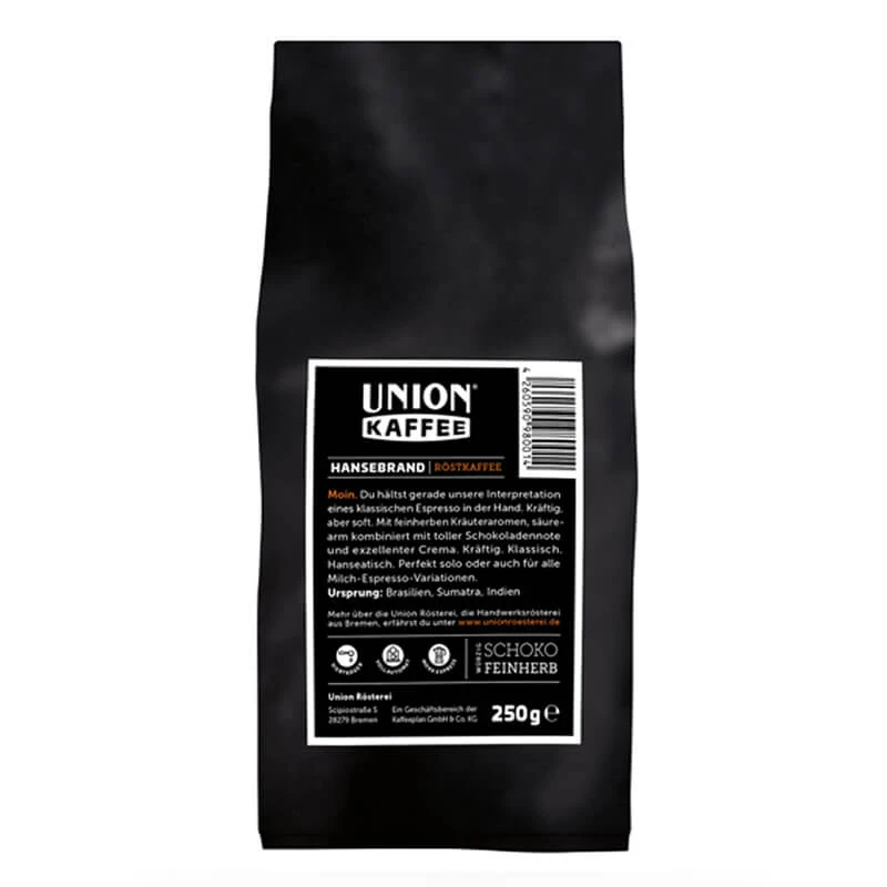 Der Blend Hansebrand von Union Kaffee besteht 80% aus Arabica Bohnen und 20% aus Robusta Bohnen. Die Bohnen stammen aus Brasilien, Indien und Sumatra. Geschmacklich ist der Blend feinherb, hat Nuancen von Gewürzen und Schokolade. In Verbindung mit Milch und Zucker werden die schokoladigen Aromen noch intensiver. Die Crema ist dunkel und üppig.